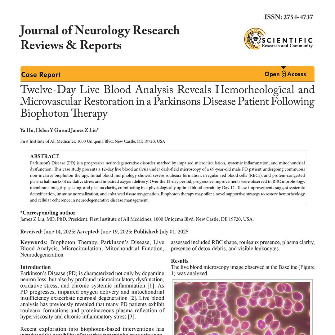 69-year-old Parkinson's patient showed transformation from clumped red blood cells in cloudy plasma to freely flowing, well-spaced cells with crystal-clear plasma over 12 days of biophoton therapy, indicating enhanced oxygen delivery and reduced inflammation.