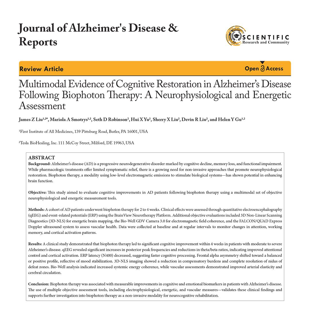 Observational study of moderate to severe Alzheimer's patients treated with biophoton therapy for 2-6 weeks showed faster, more focused brainwave patterns, quicker memory responses, healthier brain blood flow, and caregiver-reported improvements in memory, mood, and daily engagement.