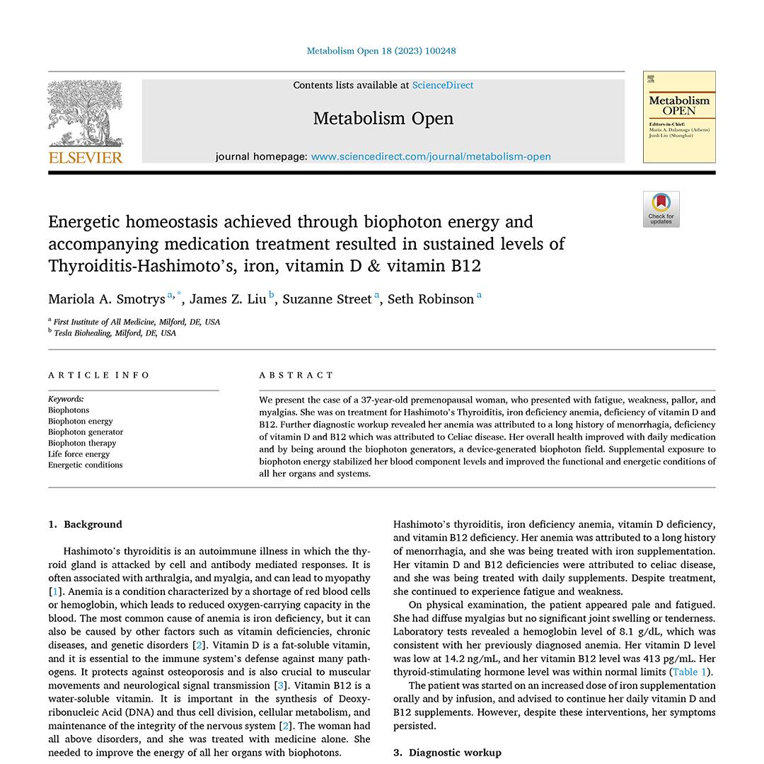 Energetic homeostasis achieved through biophoton energy and accompanying medication treatment resulted in sustained levels of Thyroiditis Hashimoto's, iron, vitamin D & vitamin B12