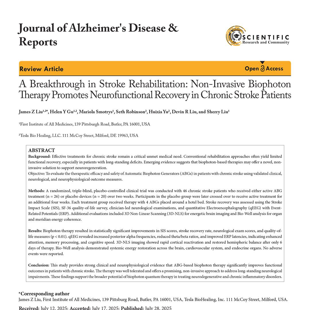 Triple-blind trial with 46 chronic stroke survivors using bedside biophoton generators showed 20-25% improvement in mobility and daily function, faster brainwave processing, more balanced brain hemisphere activity, and improved quality-of-life scores with no side effects.