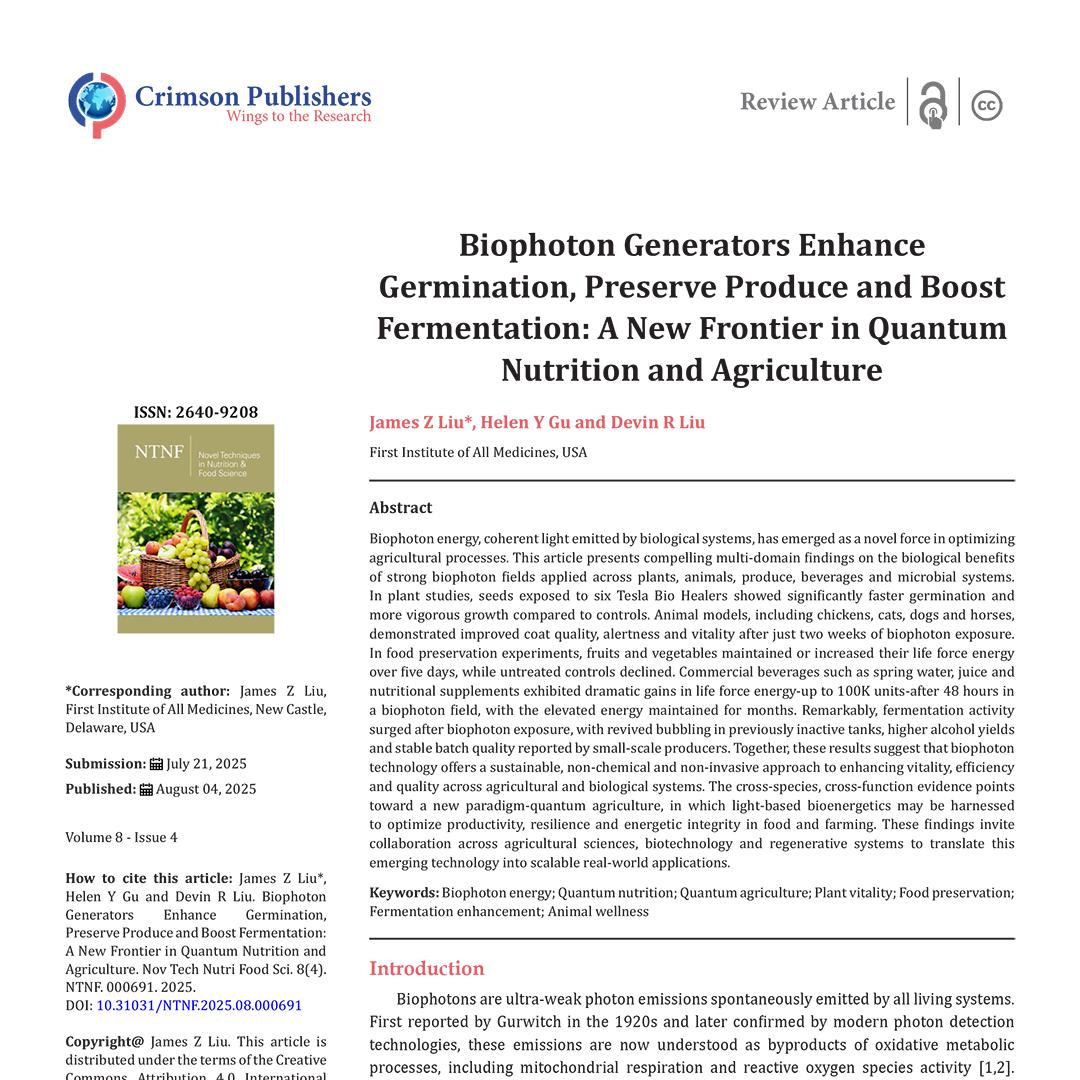 Review showing biophoton devices enhanced seed sprouting, improved animal coat quality and behavior, preserved fruits/vegetables longer, increased beverage life-force readings up to sixfold, and boosted fermentation yields - all without chemicals, pointing to sustainable quantum-agriculture applications.