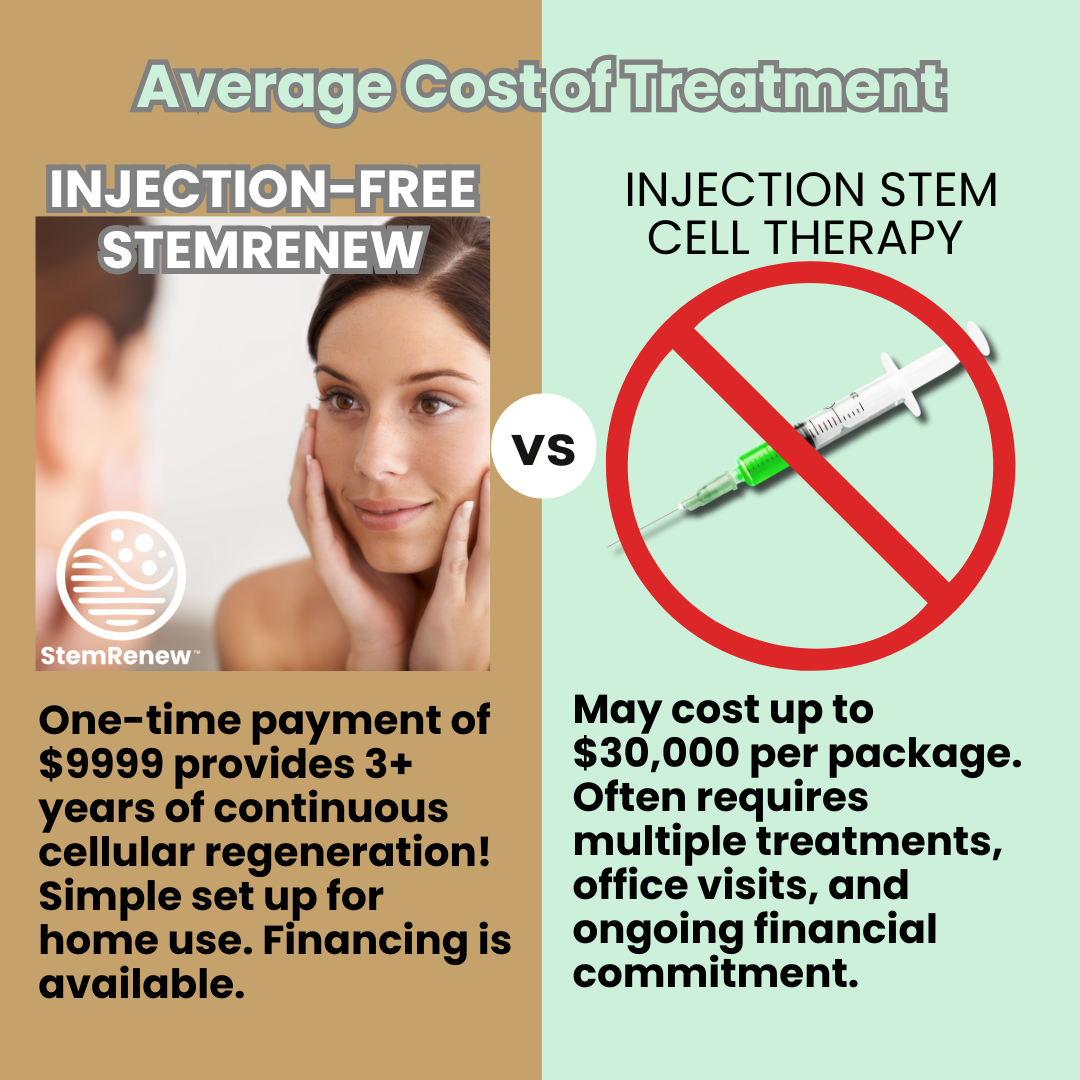 • StemRenew offers a cost-effective way to rejuvenate your body. Say goodbye to expensive therapies! Unlike injections, with a cost of $5,000–$50,000 per session, this system uses a simple four-device setup with a one-time investment and is guaranteed to last at least 3 years!